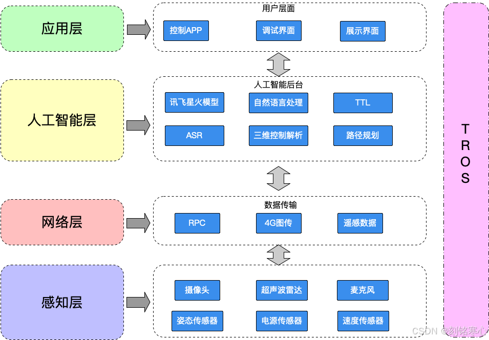 这张图是我的一个机器人项目架构图,大佬勿喷🙏!这张图从最左边可以看出是分了四层,其中除去人工智能层就是我们最基本的物联网架构了。